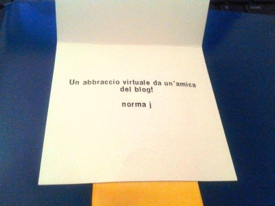 Quando oggi ho trovato l’avviso nella posta e sono andata a ritirare il pacchetto mi sono incuriosita tantissimo. Pacco leggerissimo, dentro c’era un involucro regalo, quadrato, piatto, impossibile da decifrare. Apro il biglietto e faccio un salto.