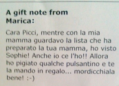 la giraffina sophie ce l'abbiamo anche noi… i miei genitori me l'hanno regalata perchè ce l'avevo già io da bambina… 🙂