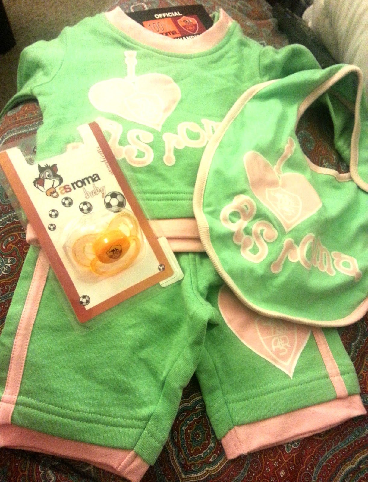 Secondo perche’ questa tutina qui sotto l’ho guardata ieri – prima volta che ci navigavo in vita mia – sul sito della Roma e volevo comprarla per My. Cioe’, per Picci, ma da regalare a lui insieme ad un’altra cosa che pero’ non ho trovato ma lui non sa nulla e spero non legga 😀