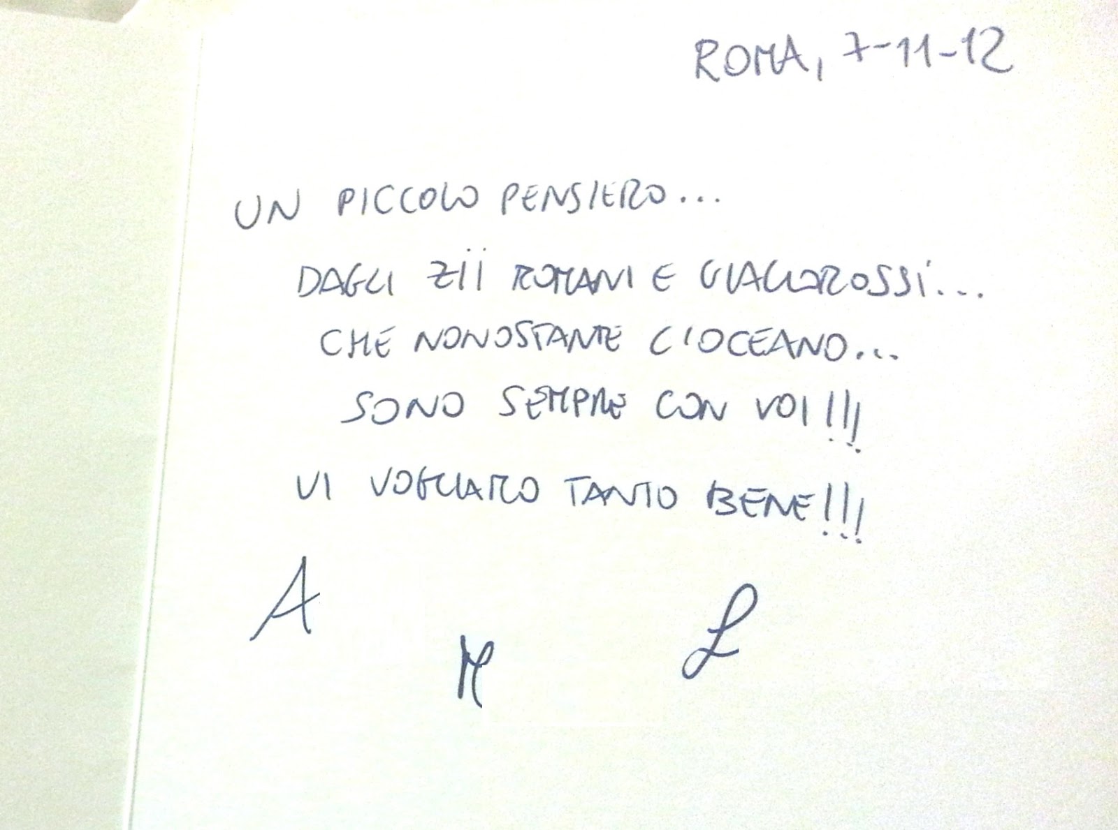Ci comunicano che un pacco ci aspetta in ufficio. Stamattina abbiamo da fare un po’ di giri, passiamo insieme a ritirarlo. Lo stupore e’ grande quando leggiamo il mittente, e il bigliettino che accompagna il pacco ci commuove gia’: