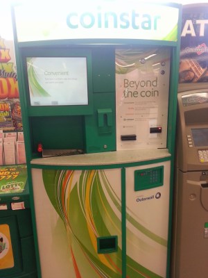 Al supermercato accanto all’ATM per il prelievo c’e’ questa macchina Coinstar. Si seguono le istruzioni sullo schermo e si decide se incassare un buono spendibile immediatamente – con service fee – , se convertire le monetine in una gift card, in credito Paypal o se fare una donazione.