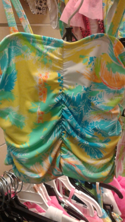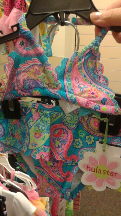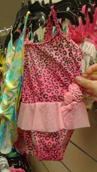 Decido quindi di andare a comprarle un costume da bimba, che non ha più perché quelli dello scorso anno (taglie 3T, sottolineo, comprati a fine agosto) sono piccoli. Vado da Ross, poi da Marshall dove trovo un unico costume carino che però si rivelerà piccolo nonostante sia 4T. Le uniche due alternative, non volendo prendere olimpionici sportivi né doppia allacciatura sulla schiena con gancetti incrociati dorati, erano queste:
