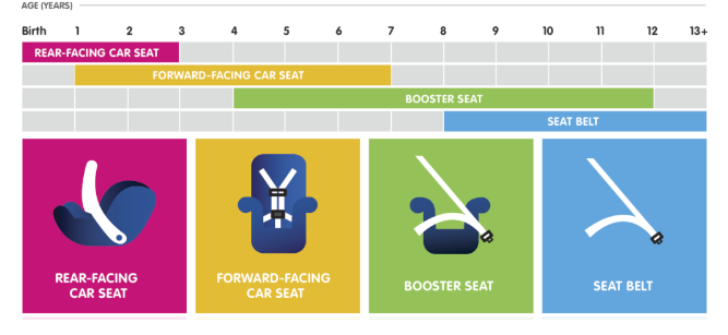- sotto i 4 anni e’ richiesto un seggiolino mentre tra i 4 ed i 5 va bene anche un booster, dipende dall’altezza e dal peso del bambino