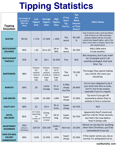Sembra che l’usanza Americana di non dare ad un cameriere la giusta retribuzione in busta paga venga dagli anni della liberazione dallo schiavismo. Sembra, ma non ho trovato molte conferme a parte questo video, che dopo la fine della schiavitu’ i neri iniziarono a lavorare come camerieri ma nessuno aveva intenzione di pagarli. Il patto era che i soldi sarebbero arrivati solo dalle mance, e cosi’ e’ rimasto. Vero, non vero, resta il fatto che in America funziona cosi’, e andare a cena, spendere 100$ e lasciare 5 dollari di mancia e’ un insulto. Certo che e’ un insulto anche pagare un dipendente che prende le mance 2.13$ all’ora. Ecco perche’ DOVETE lasciare la mancia. E’ un obbligo morale.