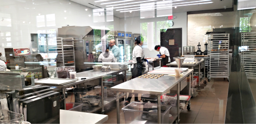 Sulla sala domina il laboratorio di cucina dove Bachour tiene anche i suoi corsi di aggiornamento. Per quanto ci riguarda, e’ meraviglioso osservare il lavoro meticoloso degli chef. Accanto alla vetrina c’e’ una barra dove si puo’ mangiare mentre si osservano creare i dolci.