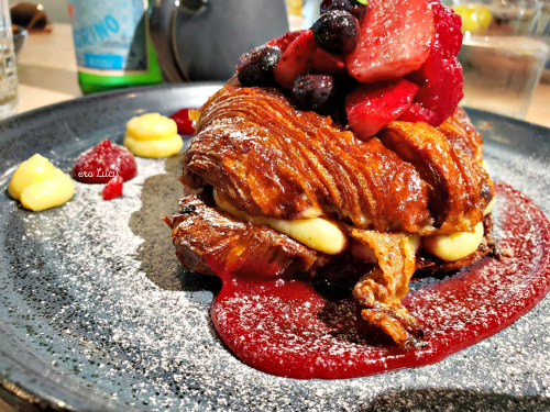 Io e mia madre puntiamo sul salato, lo Chef, gia’ detto, ama il dolce. E anche i nostri piatti sono generosissimi. Le mie uova benedict sono divine, ma il suo croissant, ragazzi. La crema chantilly e’ indimenticabile. E’ uno dei suoi signature dishes.