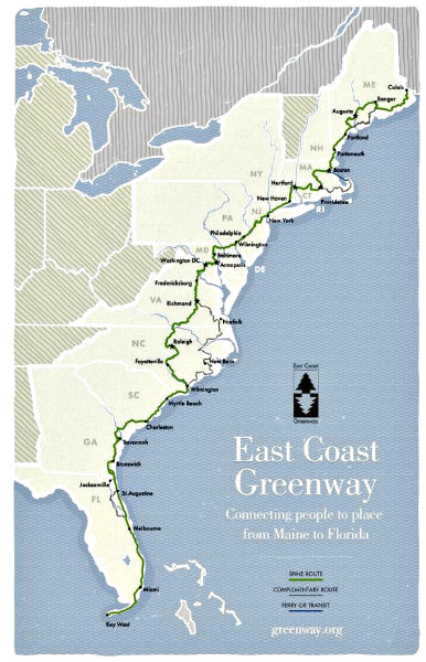 Questo non e’ un itinerario che ho fatto, ma ho pensato che potesse interessare a qualcuno. Il turismo sostenibile e’ sempre piu’ una realta’ che interessa anche una nazione come gli Stati Uniti. La East Coast Greenway e’ un progetto, ancora in divenire, nato all’inizio del 1990 che vuole unire Calais, in Maine, a Key West, Florida con un corridoio verde riservato esclusivamente a ciclisti, corridori e pedoni.