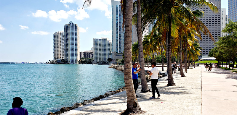 Miami Downtown 2 people taking pictures under the palms next to the ocean