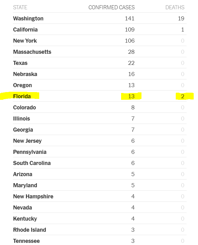 Al momento in cui ho iniziato a scrivere questo post, una settimana fa, gli Stati Uniti avevano 57 casi. Oggi, 8 marzo 2020, gli USA contano 529 positivi al Coronavirus. Una settimana fa nessun caso in Florida, ad oggi abbiamo gia’ 2 morti per coronavirus – nelle contee Lee e Santa Rosa.
