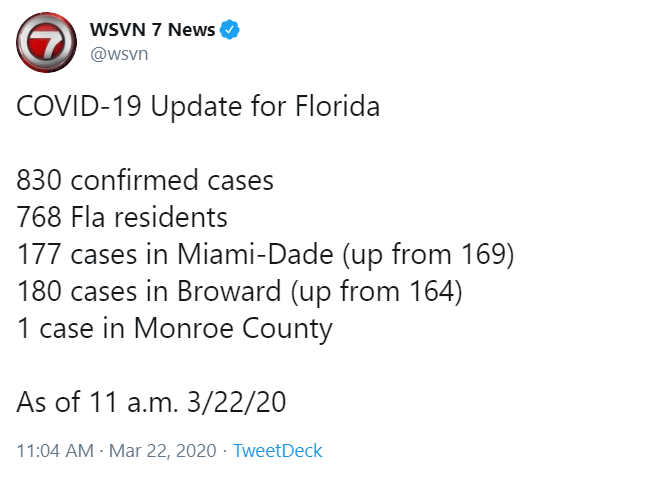 I casi in Florida continuano a crescere. Fort Lauderdale e la contea di Broward hanno piu’ positivi di Miami, questo dovuto probabilmente ai contagi successivi ad una crociera.