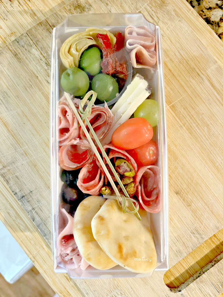 Un po’ per il Covid, un po’ per gli insetti, un po’ per praticita’, abbiamo deciso di preparare la charcuterie individuale, che abbiamo trasportato nei cooler. Abbiamo preso le scatoline per dolce e quelle per il salato – indovinate? – su amazon, insieme anche al bellissimo runner di chiffon verde salvia che vedete.
