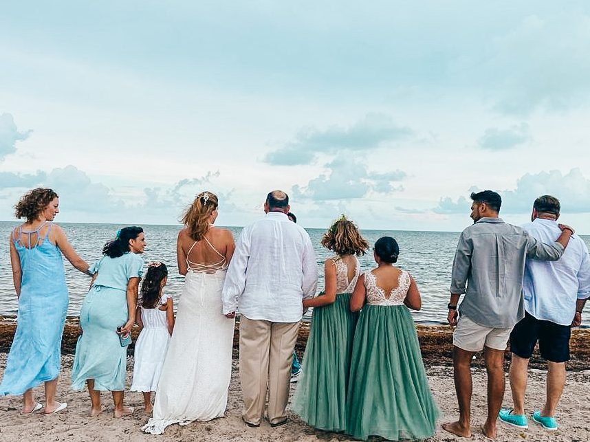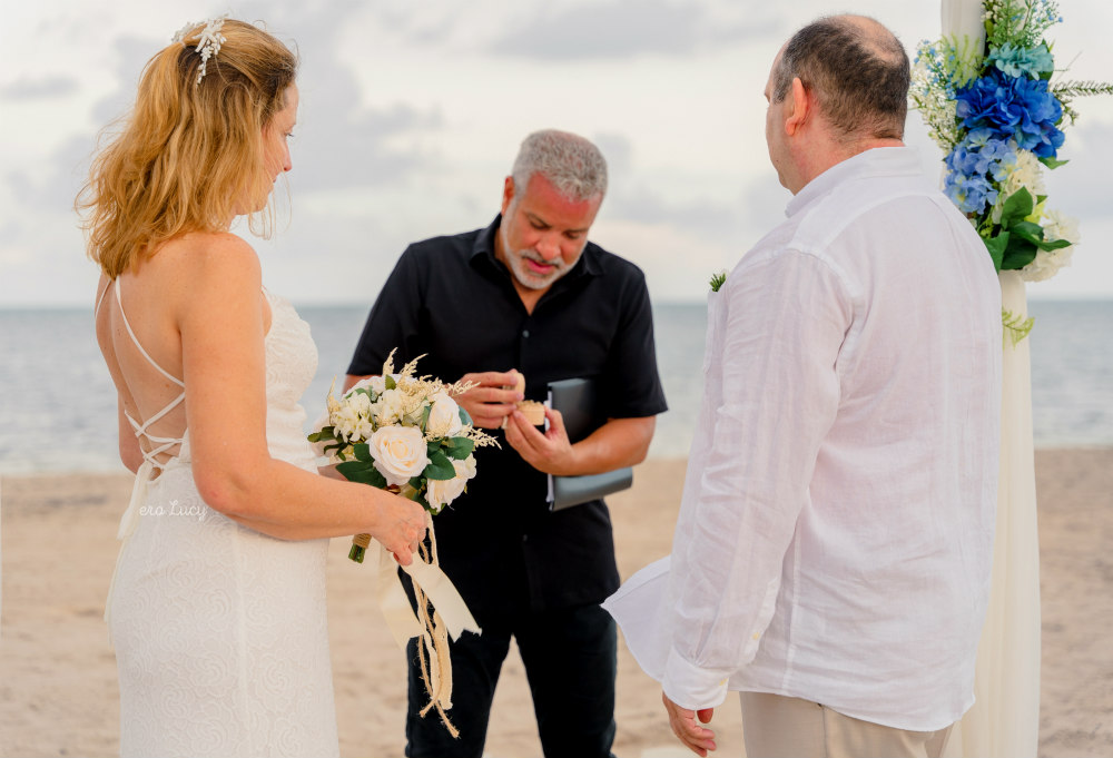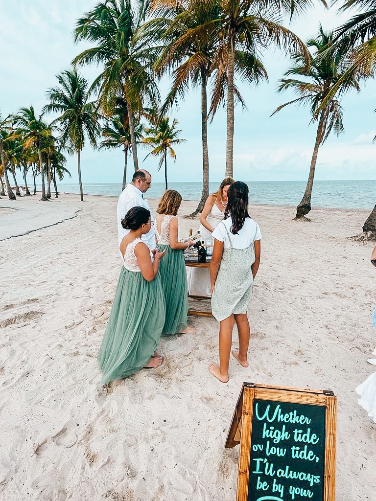 Eravamo a posto con la parte legale, quindi per noi e’ stato solo divertimento! Per prima cosa ci siamo rivolti ad una compagnia che avrebbe pensato al setting e all’officiante. Abbiamo contattato prima un’agenzia che pero’ non aveva date disponibili su Miami, quindi la scelta e’ naturalmente caduta su Mermaid Beach Weddings, che ha un profilo abbastanza semplice come siamo noi e soprattutto dei pacchetti per piccoli gruppi. Il loro taglio infatti parte da… due! Se siete una coppia che vuole fare il rinnovo delle promesse, da soli, sulla spiaggia perche’ avete gia’ avuto il festone con musica e mille persone, guardate il pacchetto “elopement“. Noi cercavamo qualcosa di diverso, per celebrare finalmente con gli amici conosciuti a Miami e che nel frattempo sono diventati famiglia. Il Covid ci ha un po’ segato le gambe e non tutti purtroppo hanno potuto partecipare, ma e’ stata comunque una cerimonia molto bella.